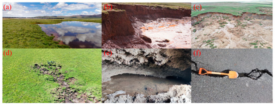 The thawing of permafrost containing a significant amount of ice leads to the emergence of various thermokarst phenomena. (a) thermokarst lakes; (b) thaw-exposed ground ice; (c) large-scale thaw slump; (d) thermokarst gullies; (e) thermokarst caves; and (f) ground ice thaw that creates large cracks in the roadbed.