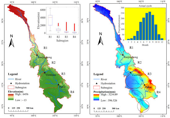 Based on the spatial distribution of topography and climate in the LMRB, the basin can be divided into four regions. The first is the upper Yunjinghong region, which covers most of the LRB and is located in China, with an average multi-year precipitation of about 985 mm. The second is the Yunjinghong–Vientiane interval, or upper MRB, which consists mainly of the northern part of Laos, with an average annual precipitation of 1440 mm. The third is the Vientiane–Pakse interval, or middle MRB, which consists mainly of the eastern part of Thailand and the central and southern parts of Laos, with an average annual precipitation of 1610 mm. There is a rainy zone in the northeast of the region (i.e., the central part of Laos). Finally, the lower Pakse, or lower MRB and delta, includes most of Cambodia, southern Vietnam, and southern Laos, with average annual precipitation of 1770 mm and a rainy zone in the eastern part of the region, roughly within the 3S basin.