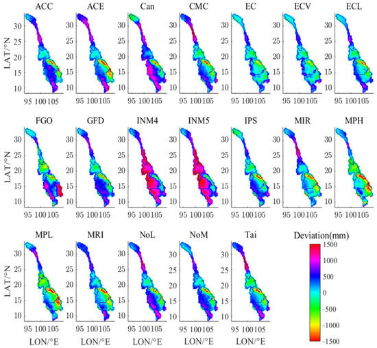 To understand the ability of each climate model to simulate precipitation in the LMRB, the simulation bias of each model for annual mean precipitation over the historical period was first analyzed, as shown in Figure 2. The bias of each model is very pronounced, up to 1500 mm for both overestimation and underestimation, which is in general agreement with the model assessment of Pimonsree et al. using the GPCC reference data [102]. Spatially, overestimation occurs mainly in the upper LMRB; i.e., in the areas with less annual precipitation, such as ACC, ACE, Can, CMC, GFD, INM4, INM5, MIR, NoL, and Tai, the models overestimate the middle and lower part of the R1 region by more than 1000 mm. Underestimation occurs in the lower LMRB in the areas with more annual precipitation, such as ACC, ACE, Can, CMC, ECL, FGO, GFD, IPS, MIR, MPH, MPL, MRI, NoL, NoM, and Tai, where the models underestimated the R3 region and part of the R4 region by more than 1000 mm, which mainly corresponded better with the areas with more than 2500 mm annual precipitation (Figure 1). Except for two models, INM4 and INM5, the bias of the annual precipitation simulation for the R2 region is relatively small, and the overestimation or underestimation is generally within 500 mm.
