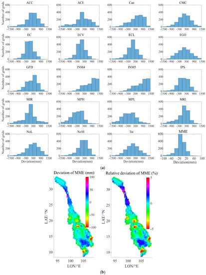 The deviations of each model after correction and multi-model ensemble (MME). (a) Deviation statistics of the corrected model and MME. (b) Spatial distribution of the deviation of the multi-model ensemble.