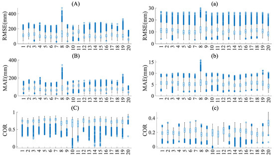 Figure 4 shows the evaluation of the simulation accuracy of daily precipitation for each model and MME after bias correction. The RMSE is 8–15 mm for most grids of each model on the daily scale and 6–10 mm for the MME. The RMSE is 70–180 mm for most grids of each model on the monthly scale and 50–70 mm for the MME. The MAE is 4–7 mm for most grids of each model on the daily scale and 3–6 mm for the MME. The MAE is 50–120 mm for most grids of each model and 30–50 mm for MME. On the daily scale, the COR of most grids of each model is 0.15–0.25, and the COR of MME is 0.3–0.35, which is still small but significantly improved compared with each model. On the monthly scale, the COR of most grids of each model is 0.55–0.8, and the COR of MME is 0.8–0.9.