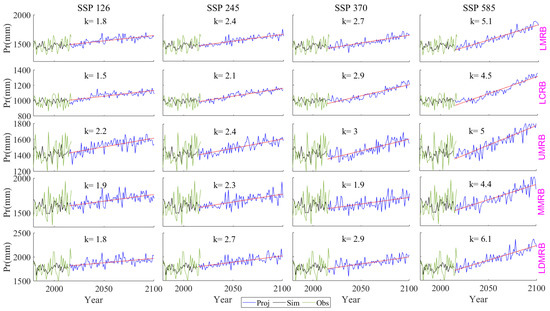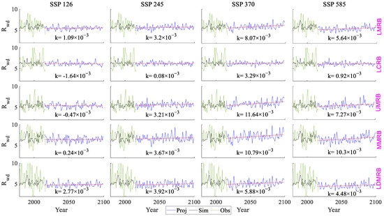 Figure 5 shows the future annual precipitation trends for each SSP scenario. Precipitation will increase in the future in the whole basin and in each region. The rates of increase in annual precipitation (k in Figure 5) for the whole basin under each SSP scenario are 180 mm/100 a, 240 mm/100 a, 270 mm/100 a, and 510 mm/100 a. Spatially, under SSP126, UMRB precipitation increases at the fastest rate (220 mm/100 a) and LCRB precipitation at the slowest rate (150 mm/100 a); under SSP245, LDMRB precipitation increases at the fastest rate (270 mm/100 a) and LCRB precipitation at the slowest rate (210 mm/100 a); for SSP370, UMRB, LCRB, and LDMRB precipitation increase the fastest (at 300 mm/100 a, 290 mm/100 a, and 290 mm/100 a, respectively) and MMRB precipitation increases the slowest (at 190 mm/100 a); for SSP585, LDMRB precipitation increases the fastest (at 610 mm/100 a) and MMRB and LCRB precipitation increase the slowest (at 440 mm/100 a and 450 mm/100 a, respectively).