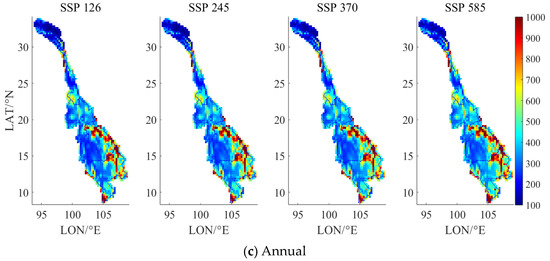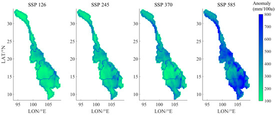 Considering the spatial variation in precipitation in the LMRB, the spatial distribution of the rate of increase in annual precipitation is shown in Figure 6. Under SSP126, SSP245, and SSP370, most regions have relatively low rates of increase (approximately no more than 200 mm/100 a), and a few regions have rates of increase exceeding 500 mm/100 a, which, when compared with Figure 1, can be seen to be in the region of higher annual precipitation in the historical period. Under SSP585, the regions with rates of increase greater than 500 mm/100 a increase significantly and completely cover the regions with annual precipitation greater than 2500 mm. This suggests that annual precipitation will increase in all parts of the basin in the future, with regions with higher annual precipitation in previous years increasing at a higher rate.
