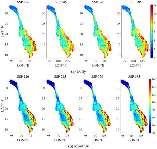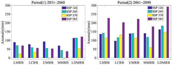 To understand the precipitation changes in different periods, two periods were selected in this study; the near future is 2031–2060 and the far future is 2061–2090. Figure 7 shows the anomalies in regional annual average precipitation for the two future periods. The precipitation anomaly in the far future is significantly higher than that in the near future. In the near future, the basin-wide precipitation anomalies are 89 mm, 71 mm, 23 mm, and 70 mm for the four SSP scenarios, while the anomalies in the far future are 136 mm, 142 mm, 114 mm, and 227 mm, respectively. For the UMRB and MMRB, the anomaly in the near future is slightly less than 0, indicating a slight decrease in the two sub-regions in the near future, and it can be assumed that there is no significant change in the UMRB or MMRB compared with the baseline period. Spatially, the LDMRB has a higher anomaly than the other partitions in the four SSP scenarios in the near and far future, while the MMRB has a lower anomaly than the other partitions in the four SSP scenarios. Comparing the four SSP scenarios, the anomaly for each region is largest in the near future under SSP126 and the largest in the far future under SSP585, indicating that the precipitation increase rate under SSP585 is lower in the near future and higher in the far future.