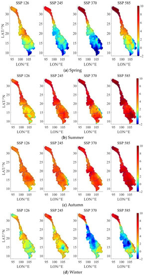 It is well known that precipitation in the LMRB varies greatly between the wet and dry seasons. Figure 10 shows the ratio of wet- to dry-season precipitation (Rwd) in different regions. The greater the difference in precipitation between the wet and dry seasons, the greater the Rwd. From the perspective of the whole basin, the Rwd shows an increasing trend under all future scenarios, of which the trend is highest under SSP370, indicating that the difference in precipitation between the wet and dry seasons will increase in the future.