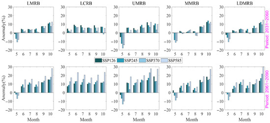 As shown in Figure 1, precipitation in the LMRB mainly occurs during the wet season (May–October), accounting for about 85% of the annual precipitation. Figure 9 shows the changes in monthly precipitation during the wet season in the two future periods. For the basin as a whole, May precipitation will decrease and June to October precipitation will increase in the future compared with the historical base period, with the increase in the far future being higher than that in the near future. At the regional scale, May precipitation will increase only in the LCRM and decrease in all three regions (UMRB, MMRB, and LDMRB) and June–October precipitation will increase mainly in these three regions.