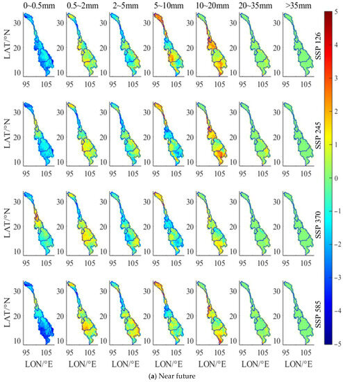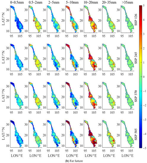Figure 11 shows the changes in the number of days with seven categories of precipitation. The number of days with a daily precipitation of 0–0.5 mm/d is mainly reduced in most parts of the LMRB under all scenarios, and in the lower LMRB (R3 and R4) is significantly reduced under SSP585 in the near future and SSP126 in the far future. The number of days with daily precipitation of 0.5–2 mm/d increases by 0–2% in most parts of the LMRB in both the near and far futures. The number of days with daily precipitation of 2–5 mm/d varies (increases or decreases) within 1% in the near future and may decrease by 3% in the far future in some areas of the LRB, Tonle Sap Lake Basin, and Mekong Delta. The number of days with daily precipitation of 5–10 mm/d will increase by 1–2% in the LRB in the near future, increase by more than 5% in the far future, decrease in the eastern MRB, and increase in the western MRB. The number of days with daily precipitation of 10–20 mm/d will increase by 1–2% in most areas in the near future, by 2–4% in most areas in the far future, and by more than 5% in some areas. The number of days with daily precipitation of 20–35 mm/d is almost unchanged in the whole basin in the near future and increases by more than 3% in some areas of R3 and R4 in the far future. The number of days with daily precipitation of more than 35 mm/d is almost unchanged in the whole basin in the near and far future.