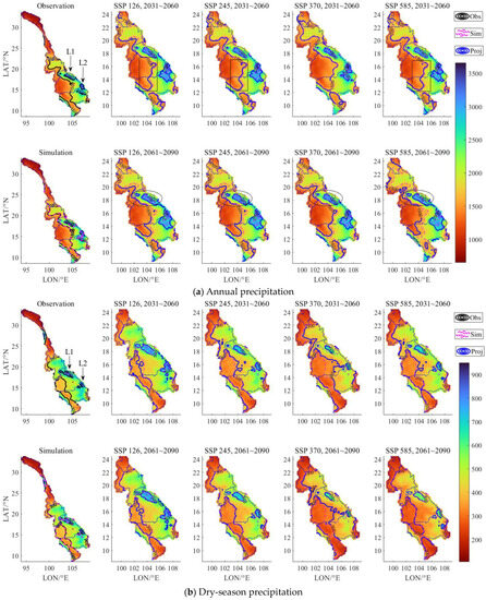 Figure 12 shows the spatial variability of the annual and dry-season precipitation distribution for the two representative isohyets. We prefer to focus on the simulation of the historical isohyets. The first columns of Figure 12a,b show the historical observed and simulated (based on MME) isohyets. It can be seen that the MME-based isohyets overlap very well with the observed isohyets for both annual and dry-season precipitation. This suggests that the MME can capture the spatial distribution of precipitation well, which gives us confidence in understanding the change in isohyets in future periods. We compared the change in isohyets between the future projection and the simulation for the base period (rather than the observed isohyets) to analyze the spatial variability of future precipitation.