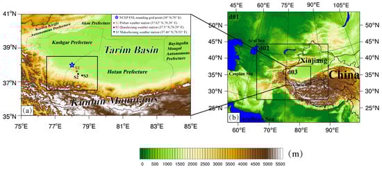 Figure 1. (a) Geographical position and surface altitude (shading, units: m) of the study area where the rainstorm took place. The blue five-pointed star (☆) represent the position of the NCEP·FNL sounding grid point, and the black and red dots indicate the positions of the ground-based automatic weather stations (AWSs) (i.e., S1, S2, and S3). The black rectangular box represents the primary study area. The national boundaries are depicted by solid black lines, while the district boundaries are illustrated using thin gray lines. (b) Geographical positions and surface altitude (shading, units: m) of the WRF model domains.