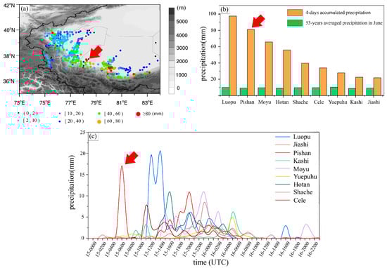 Figure 2. (a) The spatial distribution of 4-day accumulated precipitation (units: mm) over the northern slope of Kunlun Mountains from 14 to 17 June 2021. (b) The 4-day accumulated precipitation intensity (orange bars) at 9 stations and the over 50 years (1966–2018) of climatologically averaged accumulated precipitation (green bars) in June from 1990 to 2020. (c) Hourly variations of precipitation at the 9 stations from 0000 UTC on 15 June to 2300 UTC on 16 June. The red arrows point to the Pishan Station and the precipitation observed at the Pishan Station which is located in the major focused area of this study.