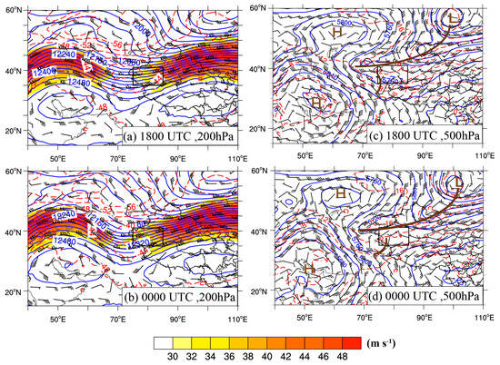 Figure 3. (ad) Geopotential height (indicated by blue solid lines, units: gpm), temperature (depicted with red dashed lines, units: °C), and wind field (half barbs, full barbs, and flags represent 2, 4, and 20 m s−1, respectively) for both 14 and 15 June 2021, obtained from ERA5 data. The regions shaded in color in (a,b) indicate that the upper-level jet (units: m s−1) exceeded 30 m s−1. The thick brown dashed lines in (c,d) indicate the trough, and the letters “H” and “L” indicate the high- and low-pressure centers, respectively. The particular time and altitude level corresponding to each of the panels are denoted in their lower right corner. The black box represents the innermost layer of the model simulation.