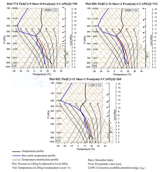 Figure 4 shows the atmospheric stratification conditions during the period of CI and convection development near the Pishan. Due to the lack of conventional sounding data in Pishan County, we used NCEP·FNL data from a location (38°N, 78°E; indicated by the pentagon symbol in Figure 1a) near the Pishan meteorological station for the Skew-T diagram. At 0000 UTC on 15 June (Figure 4a), the lower layers showed relatively dry conditions, with a dew point depression (TTd) of ~10 K, and this relatively dry condition persisted up to about 450 hPa (TTd < 10 K). At this time, the convective available potential energy (CAPE) was 750 J kg−1. Additionally, the wind speed increases slightly (from ~6 m s−1 to ~8 m s−1) with the increase in altitude at around 1–2 km above sea level (ASL), while the wind direction showed uniform northeasterlies. At 800–600 hPa heights, wind direction exhibited a clockwise rotation with the increase in altitude (i.e., veering vertical wind shear), indicating the presence of a pronounced warm advection at this level. At 0600 UTC (Figure 4b), the near-surface air was dominated by northerlies, and the air in the low level below 700 hPa exhibited rather wet conditions with the dew point depression of 2–3 K. The atmosphere from ~700 hPa to 300 hPa showed a near saturated condition. There was still significant warm advection depicted by the veering vertical wind shear wind direction near the level of 700 hPa, and with the CAPE of 713 J kg−1. At 1200 UTC on 15 June (Figure 4c), the dew point depression in the layer between 600–450 hPa increased to about 2 K but generally still showed rather wet condition in the layer of 825–300 hPa. Meanwhile, a warm advection was still present at the level 850–500 hPa, with CAPE weakening to 269 J kg−1. Although the CAPE at the previous two times are not so high, the decrease in the CAPE at this time indicates the release of the instable energy above the study area after the CI. In general, the layer above 300 hPa is rather dry at all three times, and the presence of a condition with dry air above and moist air below was highly favorable for the CI of convective weather.