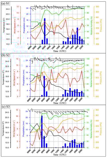 It can be seen from the observations from Station S2 (Figure 5b) that the precipitation also occurred in the period from 0500 to 0700 UTC, reaching its maximum value at 0600 UTC. The wind speed significantly increased from ~2 m s−1 to ~8 m s−1 at between 0200 and 0300 UTC, and the wind direction shifted to east at about 0500 UTC. The changes in relative humidity, atmospheric pressure, and temperature were consistent with those observed at station S1, possibly due to their close geographical locations. At Station S3 (Figure 5c), the precipitation occurred at a similar time period as that of the S1 and S2, but it reached its maximum value at 0500 UTC. The wind speed at S3 increased notably from 1 m s−1 to 6 m s−1 in the period between 0100 and 0200 UTC, and the wind direction shifted to the east at 0200 UTC. The relative humidity demonstrated a more significant variation, rising from about 52% to 90%.