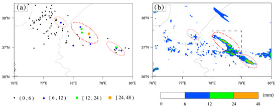 Figure 6. (a) Observed 3 h accumulated precipitation (color-coded dots, units: mm) observed by AWSs between 0500 UTC and 0800 UTC on 15 June 2021. (b) Simulated 3 h accumulated precipitation (shading, units: mm) during the same time period as (a).