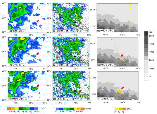 Figure 7. (ac) The temperature of the black body (TBB, shading, units: °C) over the top of the rainfall clouds observed by the FY-4A meteorological satellite on 15 June 2021. (df) Simulated composite radar reflectivity (shading, units: dBZ), the height of topography (black solid contours, units: m), and wind field (half barbs, full barbs, and flags represent 2, 4, and 20 m s−1, respectively) at 2500 m ASL on 15 June 2021. (gi) Simulated composite radar reflectivity (colorful shading, units: dBZ) terrain height (gray shading, units: m) at the same time as (df). The red line segment AB shows the position of the verticalcross section which will be shown Figures 9–12 in following section. The red solid arrow points to the cloud cluster which represent the major convection initiation (CI) over the Pishan area. The specific time and height level corresponding to the each of the panels are shown in their lower left corner.
