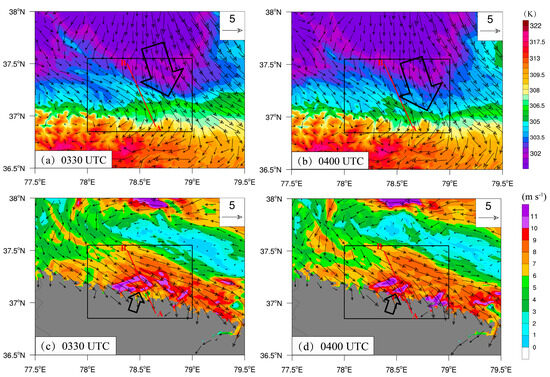 Figure 8. (a,b) Potential temperature (shading, units: K) at the WRF model layer η = 0.9970323 and the horizontal wind field (black vector arrows) on 15 June 2021. (c,d) Horizontal wind speed (shading, units: m s−1) and the horizontal wind field (black vector arrows) at 2500 m ASL at the same times as (a,b). The gray shaded area indicates altitudes higher than 2500 m ASL. The black rectangular box represents the area which will be shown in Figure 7g–i. The red line segment AB is the same one shown in Figure 7h, indicating the locations of the vertical cross-sections in Figure 9, Figure 10, Figure 11 and Figure 12 in following section. The specific time and height level corresponding to each of the panels are shown in their lower left corner.
