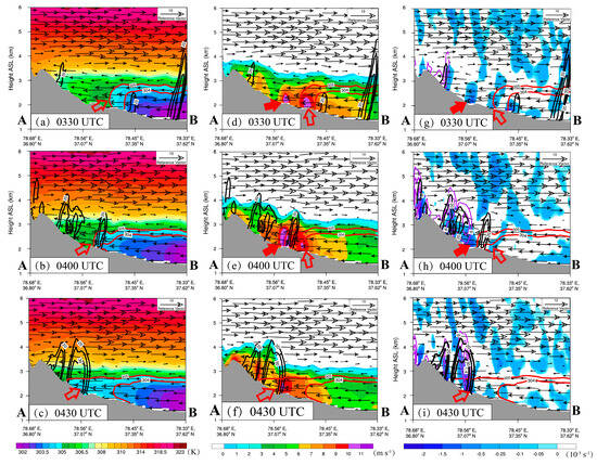 Figure 9. (ac) Vertical cross section of the potential temperature (θ, shading, units: K), along the line AB (shown in Figure 8) at 0330, 0400, and 0430 UTC on 15 June 2021, composite reflectivity (black contour lines, units: dBZ), and horizontal wind speed (black vector arrows). Images (df) are the same as (ac), but represent horizontal wind speed (shading, units: m s−1) and composite reflectivity (black contour lines, units: dBZ). Images (gi) are the same as (ac), but represent divergence (shading, units: 10−3 s−1), vertical velocity (purple contour lines, units: m s−1), composite reflectivity (black contour lines, units: dBZ), and horizontal wind speed (black vector arrows). The red solid lines (304 K and 305 K isotherms) represent the thermal boundary of the CP, the red solid arrows indicate the region affected by BLJ, and the red hollow arrows indicate the position of the leading edge of the CP. The gray shading represents the terrain, and the specific time is displayed in the lower left corner of each panel.