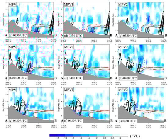 Figure 10. (ac) Vertical cross section of the moist potential vorticity (MPV, shading, units: PVU, where 1 PVU = 10−6 m2 K s−1 kg−1) and composite reflectivity (solid black contours, units: dBZ) along the line AB at 0330, 0400, and 0430 UTC on 15 June 2021, respectively. Images (df) are the same as (ac), except for the MPV1 (shading, units: PVU, where 1 PVU = 10−6 m2 K s−1 kg−1), and (gi) are the same as (ac), except for the MPV2 (shading, units: PVU, where 1 PVU = 10−6 m2 K s−1 kg−1). The red solid lines (304 K and 305 K isotherms) indicate the thermal boundary of the leading edge of the CP, and the gray shading represents the terrain, and the specific time is shown in the lower left corner of each panel.