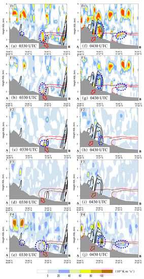 Before the CI (i.e., 0330 UTC), it can be seen from the vertical cross section of the HG ω (Figure 12a) that there are two high-value centers over the windward slope, one is located near the leading edge of the CP, and the other one is influenced by the BLJ. At the time of CI (i.e., 0430 UTC), two high-value centers are presented inside the cloud cluster (indicated by blue dashed ellipses), which indicates a significant horizontal gradient of vertical velocity at the leading edge of the CP. These high-value centers are highly consistent with the distribution of F4. In the lower layers below 3 km ASL, there is a prominent high-value center of HG θ e near the leading edge of the CP before the CI (i.e., 0330 UTC) (indicated by a blue dashed ellipse). At the CI time (i.e., 0430 UTC), with the southward movement of the CP, the high-value center of the HG θ e also moved to above the windward slope (indicated by a blue dashed ellipse). There is also a high-value center inside the rainfall cloud cluster (indicated by a blue dashed ellipse). The high value of HG θ e in the lower layers is mainly due to the horizontal gradients of the temperature and humidity at the leading edge of the CP, while the high-value centers inside the rainfall cloud cluster may be caused by the process of latent heat release. During the CI stage, the overall strength of HG θ e appears to be higher than that of HG ω , which indicated that the contribution of HG θ e may be greater than that of HG ω . In general, the strong convergence area in the leading of the CP and the intense vertical gradient of horizontal equivalent potential temperature near the leading edge of the CP contributed to F4 together.