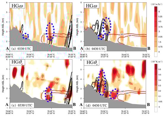 Figure 12. (a,b) Vertical profile of the vertical velocity’s horizontal gradient (i.e., HGω shading, units: 10−3 Pa s−1 m−1) and composite reflectivity (black contours, units: dBZ). Images (c,d) replicate the conditions of (a,b), with the exception of the horizontal gradient of equivalent potential temperature. (i.e., HGθe, shading, units: K km−1). The red solid lines (304 K and 305 K isotherms) indicate the thermal boundary of the CP, the gray shading represents the terrain, and the precise time is displayed in the lower right corner of each section.