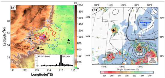 This extreme rainfall period was part of a week-long (from 17 to 23 July 2021, hereafter named as the “21.7” rainstorm) heavy rainfall episode in a broad region of Henan Province near the foothills of the Taihang and Funiu Mountains. This prolonged extreme heavy rainfall event was accompanied by abnormal synoptic conditions in East Asia (Figure 1b), including (1) the western Pacific subtropical high (WPSH) shifting northward, (2) Typhoon In-Fa located east of Taiwan, and (3) the 200 hPa South Asian high (SAH) extending northeastward, that produced ingredients conducive to heavy rainfall in Henan [1,2,3,4,5,6,7,8]. A water vapor channel, referred to as an atmospheric river (AR) in other regions [9], was established between Typhoon In-Fa and the WPSH (indicated by the strong water vapor flux in Figure 1b) that transported abundant tropical oceanic moisture over 500 km inland. The extension of the 200 hPa SAH led to upper-level wind divergence in the vicinity of ZZ, also providing favorable upper-level conditions for the development of deep convection in ZZ.