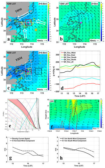 Widespread precipitation occurred in the central and northern parts of the Henan Province, with convective activities mostly in the mountainous areas west of ZZ on 20 July 2021. Figure 2a shows the horizontal winds at 0.6 km above the mean sea level (MSL) obtained from the VADRS analysis at 1200 LST, i.e., four hours before the extreme hourly rainfall in ZZ. Predominantly easterlies from the east of Henan were blocked on the southeastern slope of the Taihang Mountains and turned into northeasterlies in the form of a barrier jet [32] (see Supplementary Figure S1) that funneled into the valley towards LY, whereas east of the Funiu Mountains was southerly flows towards the Song Mountains (SM) and ZZ. Together with the easterly flows east of ZZ, a three-way low-level convergence was set up at ZZ that had the potential to produce extreme rainfall. In the lower troposphere (Figure 2b), there was a mesoscale vortex located west of ZZ [18,33]. The horizontal winds of this low-level mesovortex were primarily southerlies/southwesterlies over ZZ, which showed an increasing trend from 1000 LST, with a moderate speed of ~14 m s−1 at 1600 LST (see Supplement Figure S2). By 1600 LST, the low-level convergence at ZZ was strengthened, with the maximum more than doubled from 1.4 × 10−3 s−1 at 1200 to 3.5 × 10−3 s−1 (Figure 2c). Easterly winds increased toward ZZ, leading to the enhancement of convergence.