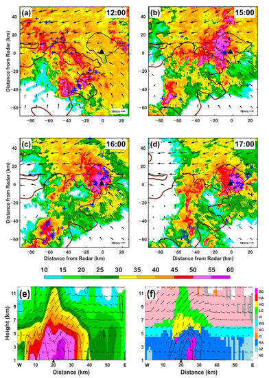The hydrometeor classification algorithm (HCA [27]) based on the polarimetric radar data indicates graupels (large rain drops) above (below) the freezing level (Figure 3f). The combination of the large reflectivity ZH (~58 dBZ), differential reflectivity ZDR (~3.0 dB), and differential phase KDP (~4° km−1) near the surface beneath the updraft signals intense rainfall with the presence of large and oblate raindrops [39,40]. Positive ZDR and KDP columns were collocated with the updraft, where the region of ZDR > 1.0 dB and KDP > 1.5° km−1 extended to a 6.5 km altitude, indicating supercooled liquid particles lifted above the freezing level (~5 km) by the strong updrafts (Figure 3e,f) [41,42]. The existence of the supercooled liquid water favored the riming process and the presence of graupel in the updraft region above the freezing level.
