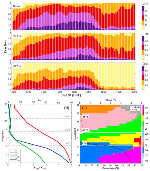 The time series of the ZH, ZDR, and KDP fractions in specified value bins from 1200 to 2000 LST on 20 July 2021 are presented in Figure 4a–c. The polarimetric radar variables come from the 30 × 30 km box centered at the CS (labeled in Figure 3) at 2.0 km MSL. As the CS developed to the mature stage between 1600 and 1700 LST, the radar reflectivity values were frequently above 50 dBZ. About 20% of the ZDR samples exceeded 2.0 dB in this hour, which was obviously higher than in any other hour, indicating abundant large raindrops formed in the CS. In addition, the fractions with a high KDP value (over 3.0° km−1) also peaked in the same hour, suggesting the dominance of extreme liquid water contents and instant rain rates at this vertical level. The significantly higher fractions of large polarimetric radar variables compared with other hours are consistent with the hourly extreme rainfall at the surface.