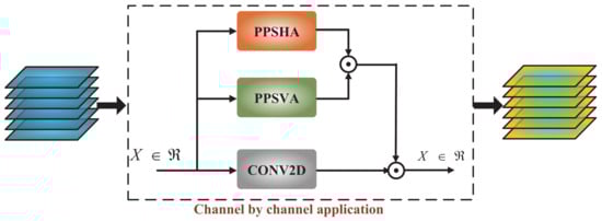 Similar to the PPSHA model, a vertically-oriented point-by-point attention model called PPSVA is developed. In this model, each column of the feature graph is converted into three new feature graphs by using three linear transformation matrices. Moreover, each column of the three feature graphs is determined via the dot product method to achieve vertical attention feature extraction. In the PPSVA model, is an input image, and this model processes all image columns in three linear transformation layers to produce three vertical feature maps denoted by , , and , where , , and . Therefore, the correlation operation is conducted to yield the output vertical feature map as follows: