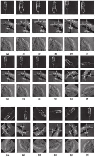 In order to mitigate the effects of random model parameter initialization and data sampling on recognition performance, multiple experiments were conducted using the average values of the results to evaluate the effectiveness of the model. As indicated, the dataset contained imbalanced data, with 66 images of planes compared to 578 images in other categories. This imbalance can introduce a bias toward categories with more samples, decreasing recognition rates for underrepresented categories. Furthermore, the total of 1128 samples in the dataset increased the overfitting risk for classifiers. The study employed standard data augmentation techniques, such as rotation, flipping, and cropping, to preprocess the data to counter these challenges. These methods encompassed various cropping types, equal height or width stretching, contrast adjustment, clockwise rotation (with angles ranging from 45° to 315°), and horizontal flipping. The results of these transformations are depicted in Figure 7.
