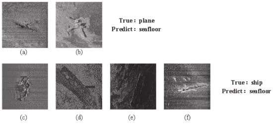 (a) small scale crashed aircraft (b) ambiguity crashed aircraft (c) ambiguous shipwreck (d) low contrast shipwreck (e) low contrast shipwreck (f) small scale shipwreck. Example of misrecognition of classic deep learning object recognition.
