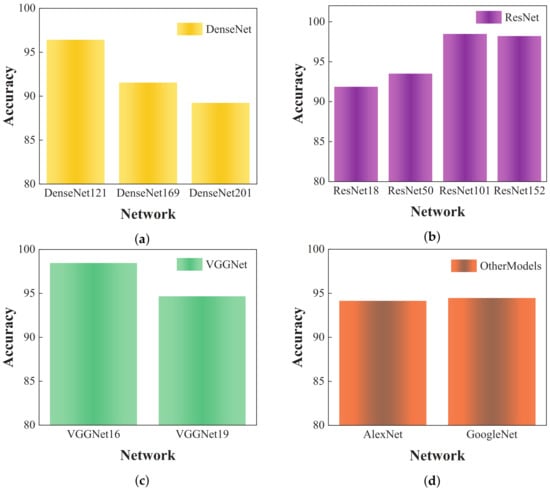 DenseNet (201, 121, 169), ResNet (50, 101, 152), and VGGNet (16, 19) are among the most frequently employed network architectures for object recognition in recent research. Therefore, in this study, the above-mentioned methods were selected for comparative analysis. All these models utilized a standard open network structure. In order to maintain recognition accuracy, input images were consistently resized to 224 × 244 pixels, ensuring alignment between learning rate and batch size. Figure 8 displays the experimental outcomes.