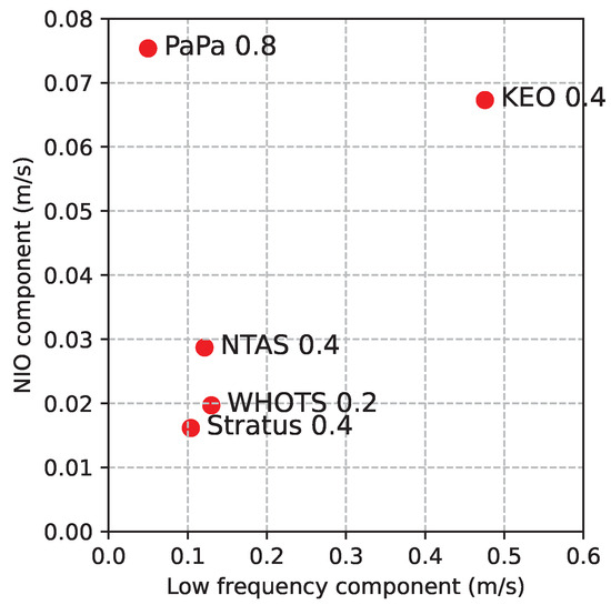 This figure highlights the distribution of currents in the global ocean. The hourly time series of the surface velocity was separated into low and high-frequency components using a high-pass Butterworth filter with a cutoff period of 4 days. The NIO was bandpass-filtered between . The observed current velocity at the five stations is plotted on low-frequency (x-axis) and NIO-velocity (y-axis) coordinates. The numbers next to the label are the ratio between NIO-kinetic energy and total high-frequency motion kinetic energy.