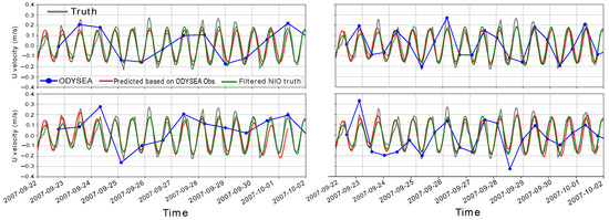 An example of the slab model reconstruction (red curves) of the NIO based on simulated ODYSEA observations (blue dots) for the 1k-km swath (left) and 1.8 k-km swath (right) using the station Papa observations is shown. The upper panels display the results without noise, while the lower panels incorporate the influence of random observational errors in surface currents, with a Gaussian error of 10 cm/s RMS. Only zonal velocity is plotted in this illustration. The gray curves represent the observed velocity high-pass filtered with a cutoff period of 30 days. The low-frequency component is removed from both ODYSEA (dots) and truth (gray curves). The green curives represents the true NIO derived from the gray curve using a bandpass Butterworth filter within the frequency band .