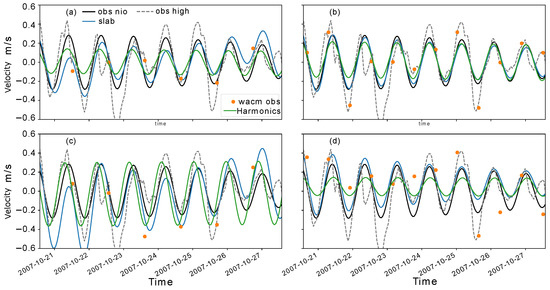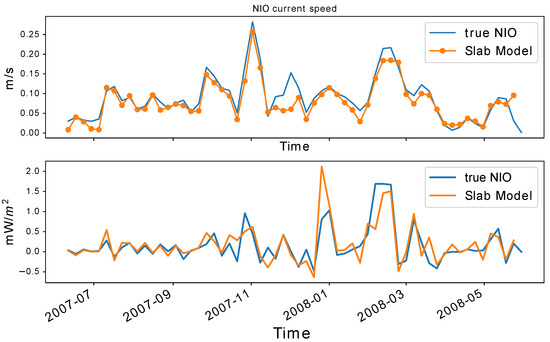 Conversely, the slab model uses the sparsely sampled velocities as a constraint to enforce oscillations at the inertial frequency. The results in this case demonstrate a high level of skill in retrieving the missing information. The red curves represent the slab-model retrieval and compare well with the true NIO (green lines), even for cases with 10 cm/s ODYSEA observational errors (lower panels). The RMS difference between the filtered NIO and the slab-model reconstructed NIO is below 2 cm/s. The high performance of the slab model at Station Papa is consistent throughout the entire year (Figure 7, upper panel). The slab-model reconstruction (orange line) matches well with the true NIO (blue curve) (bandpass-filtered ocean currents).