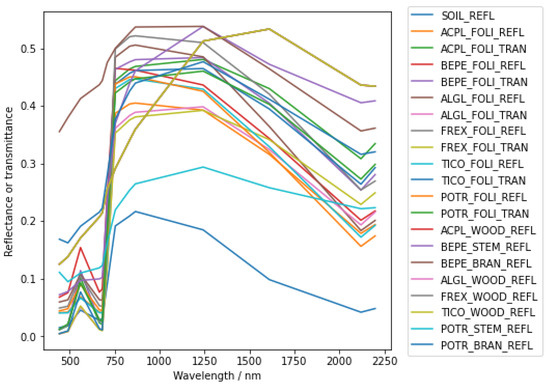 Some tree models and scenes from the radiative transfer model intercomparison (RAMI, https://rami-benchmark.jrc.ec.europa.eu/, accessed on 10 September 2023) [25] are often taken as the standard structure to evaluate new radiative transfer models. In this study, the Järvselja Birch stand (summer) scene, including the tree models (Figure 2) and their spectral characteristics (Figure 3) were used to construct an example scene. The scene was generated on the basis of 12 individual tree representations. These were distributed among the following tree species: ACPL = maple (Acer platenoides), BEPE1-4 = birch (Betula pendula), ALGL2 = alder (Almus glutinosa), TICO2-5 = linden (Tilio cordata), POTR1 = poplar (Populus tremuloides), and FREX = ash (Fraxinus exelsior). An overview of the characteristics of these tree representations can be found on the RAMI webpage (https://rami-benchmark.jrc.ec.europa.eu/, accessed on 10 September 2023). The scene was a subset of the Järvselja Birch stand (summer) scene, and the selected tree models were mainly Betula pendula and Tilio cordata models. The tree heights of Betula pendula vary from m to m, and those of Tilio Cordata vary from m to m. Thus, there were several Tilio cordata crown models beneath the crown models of Betula pendula.
