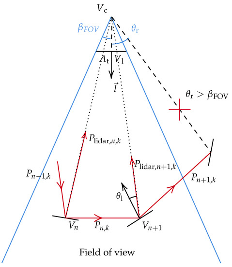 In this section, the ray tracing algorithm is applied to simulate a LiDAR signal. According to the ray tracing algorithm, a virtual laser is supposed to emit virtual laser beams in 3D space. The returns are obtained by calculating the intersection points of the virtual laser beams and the scene elements. If an intersection point can be “seen” in the field of view of the sensor, scattered energy is received by the receiver (Figure 4).