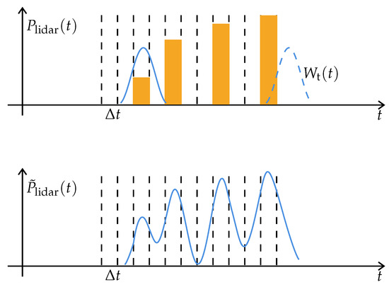 The principle of using LiDAR to scan objects can be simply described as follows. A laser emits pulses (the time-dependent function of which is denoted ) towards the object (whose properties that are concerned can be accounted for by introducing the target profile ) and then some of the energy is scattered back to the sensor where it is measured with an optical receiver (which has a system response function denoted ). A timer measures the travel time of the pulse from the laser to the object and back to the laser scanner. The distance of the sensor to the object can be calculated based on the time of flight. Symbolically, this is an equation [27,28] representing the fundamental relations between the characteristics of the sensor, the target, and the received signal: