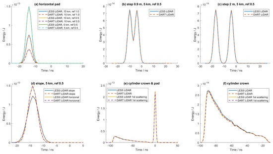 Several test cases were designed and conducted to simulate LiDAR waveforms. Lambertian scene objects were built, including pads, steps, slopes, and plant crowns (Table 1 and Figure 1), with different reflectances and LiDAR device altitudes. Note that the heterogeneous cylinder is from the radiative transfer model intercomparison (RAMI, https://rami-benchmark.jrc.ec.europa.eu/, accessed on 10 September 2023). The results were compared against references generated by the DART LiDAR module [17,18].