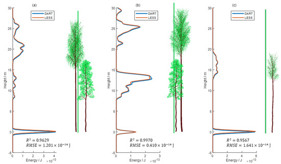 The LESS LiDAR simulator is evaluated with the DART LiDAR module, including full waveforms and point clouds. The differences between two sets of data are assessed with the relative error, root mean square error (RMSE), or the coefficient of determination.