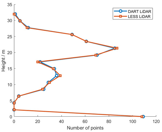 The total returned point numbers are also listed in Table 8, and it can be seen that there are a few differences among the three models. LESS LiDAR obtains 6.6 million points in this case, which is between DART LiDAR and HELIOS++. LESS LiDAR and DART LiDAR achieve similar ground points. HELIOS++ has the most number of the total points, while the least number of ground points. DART LiDAR has the least non-ground points. All the sets of simulated points can be registered well with each other and the differences perhaps relate to the parameters and data processing methods used in each model.
