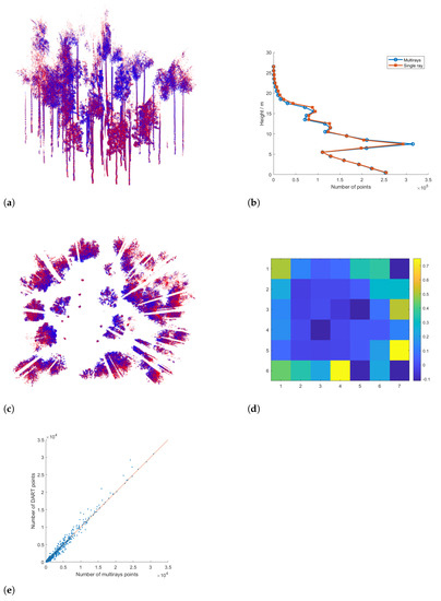 Considering the numbers of points generated by both modes, similar values were observed: approximately 6.2 million points for the single-ray mode and 6.6 million points for the multi-ray mode. However, it is noteworthy that the single-ray point cloud mode exhibited slightly fewer points, approximately 6.0% less than the multi-ray point cloud mode.