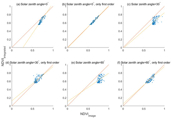 The NDVI values derived from the integrated waveform energy (Equation (22)) are compared with the NDVI values derived from the simulated multispectral images with different incident solar directions (Figure 13). The differences between NDVIs from the integrated waveform energy and the image arise from two features of the illumination conditions. One is related to the geometry of the source–object–sensor. It is known that as anisotropic objects, reflectance from land surface is different with different incident and viewing directions. As an active sensor, LiDAR always receives backward signals (hot spot directions with small zenith angles), while passive sensors often receive signals reflected by the land surface of solar light with different incident and viewing directions. Therefore, it can be seen that there is a better correlation between NDVIs from waveforms and the image with SZA = 0 (Figure 13a) than those cases with SZA = 30 (Figure 13c) and SZA = 60 (Figure 13e). Another reason is the issue of the adjacency effect. When generating LiDAR data, most of the accumulated contributions come directly from the elements within the footprints, while the whole scene is illuminated by the sun when generating images, and there are contributions of scattering from nearby pixels. There is more vegetation around the pixel, which causes a higher reflectance in the NIR band due to multiple scatterings. Therefore, the NDVI values derived from the images are apparently higher than those from the LiDAR waveform due to the adjacency effect. If considering the first-order scattering results only, the differences of NDVIs from the image and LiDAR decrease obviously and the corresponding coefficients of determination increase (Figure 13b,d,f).