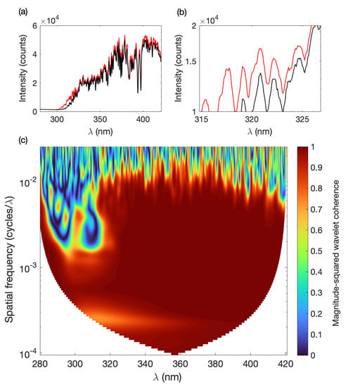 The narrowband structure of sky-scattered UV spectra is dominated by strong Fraunhofer lines. (a) Two Fraunhofer spectra recorded under the same measurement conditions at the Earth Observatory of Singapore (EOS) on 27 January 2022 at 10.15 am (the overlapping black and red lines). Both spectra were recorded with a zenith viewing angle and show (b) small differences in intensity. (c) The Magnitude-Squared Wavelet Coherence (MSWC) between the two spectra, where 1 indicates that the two spectra are well-correlated. The MSWC is obtained using ‘wavcoherence’ function in MATLAB [] using input (0.07 /channel) and default analytic Morlet wavelet. Data occupying the cone of influence (which is potentially affected by edge-effect artifacts) has been removed. Both spectra were acquired using OceanView [] and recorded using a FLAME-S UV spectrometer with ILX-511B Sony detector, combined with 2400 lines/mm grating and 50 µm slit (∼0.5 nm FWHM—full width at half maximum).