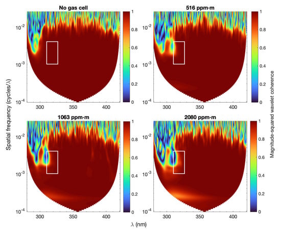 The MSWC between a ‘clear-sky’ Fraunhofer spectrum and spectra recorded with a gas cell of known SO concentration in the field of view. Gas cell concentration is displayed on top of each subplot. All spectra were recorded with a zenith viewing angle. The MSWC was obtained using ‘wavcoherence’ function in MATLAB [] using input (0.07 /channel) and default analytic Morlet wavelet. Data occupying the cone of influence has been removed. The white box indicates the fixed extraction window referred to in subsequent sections and plotted in Figure 5.