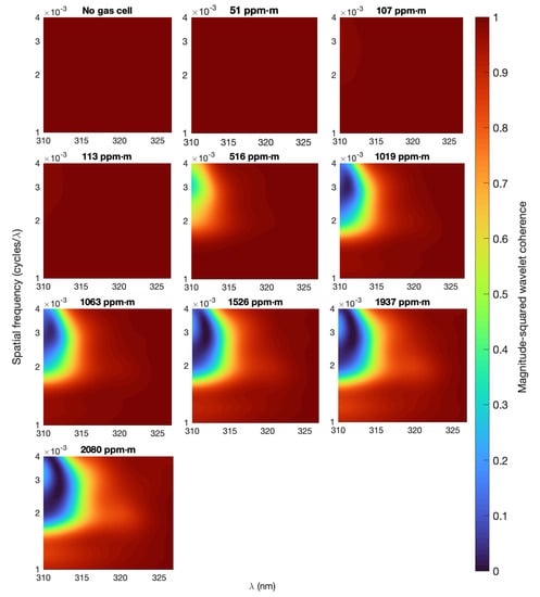 Although UV spectra of sunlight scattered in the atmosphere vary in intensity, they are dominated by strong Fraunhofer lines. These occur at specific wavelengths, and when spectra are viewed in the frequency domain, the observed Fraunhofer lines have the same spatial frequency signature. We demonstrate this by calculating the Magnitude-Squared Wavelet Coherence (MSWC) of two measured Fraunhofer spectra recorded with a zenith viewing angle (Figure 2). We determine the MSWC using the MATLAB [] ‘wavcoherence’ function and defining an approximate sampling frequency () of 0.07 cycles/. is defined as the wavelength range of the spectrometer (in nm) divided by the number of spectrometer channels, which enables spatial frequency to be determined in units of cycles/[]. Figure 2c shows the MSWC which is a measure of the correlation between the two spectra as a function of spatial frequency. A MSWC value of 1 indicates that the two spectra correspond perfectly to one another and a MSWC value of 0 means that the spectra do not share common characteristics in the spatial frequency domain. The resulting MSWC is close to 1 for spatial frequencies less than ∼1 · 10 cycles/ between ∼300 and ∼380 nm, indicating that the two spectra are very similar in spatial frequency content within this wavelength range. Higher spatial frequencies, where the MSWC varies considerably across all wavelengths, represents the inherent variability of the photon flux []. The reduced MSWC at wavelengths < 305 nm is due to the absorption by ozone (O) [], which acts to reduce the intensity of light reaching the spectrometer such that noise dominates the signal at this range []. At the spatial frequencies which correspond to the narrowband absorption structures of SO (Figure 1b), the MSWC is 1 at wavelengths longer than ∼310 nm, suggesting that in the absence of changes to the absorption by SO in the light path, spectra are expected to be uniform at spatial frequencies of ∼2.5 · 10 cycles/.