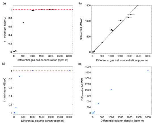Once a change in the coherence becomes apparent, we observe a linear correlation between the concentration of SO in the gas cell (Figure 6b) or the assumed column density (Figure 6d), and the differential MSWC within the defined extraction window. Although the minimum MSWC reaches 0 at around ∼1000 ppm·m SO (Figure 6a,c), the differential MSWC maintains its linearity beyond this ‘saturation level’, up to gas cell concentrations of ∼2000 ppm·m (Figure 6b). This range aligns with the SO SCDs typically reported for volcanic plumes [,,]. At high SO column densities, the differential MSWC appears to deviate from the linear trend (Figure 6d), which is likely attributed to a significant portion of the extraction window reaching the minimum MSWC (Figure S2).