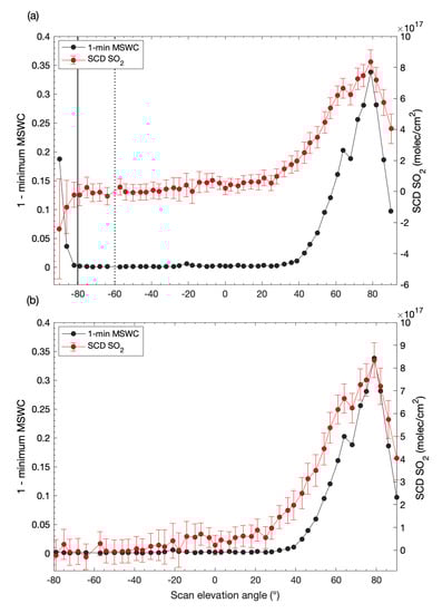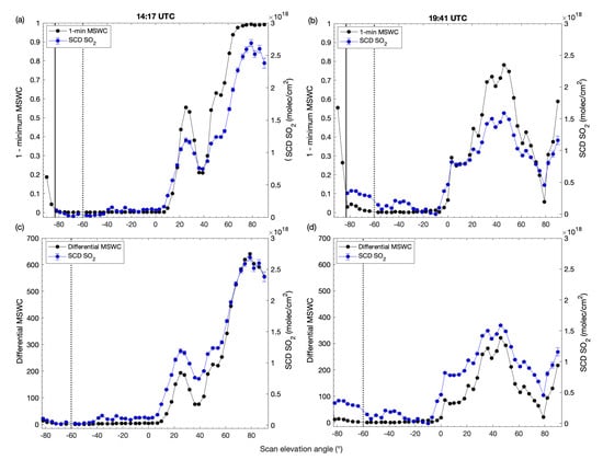 MSWC from spectra recorded at Masaya volcano on 14 March 2019 at (a,c) 14:17 UTC and (b,d) 19:41 UTC. The plot displays one minus the minimum MSWC within the extraction window, compared to the normalized SCD of SO as determined by DOAS for (a,b) all scan elevation angles. SCDs of SO are expressed in standard units of molec/cm, where 1 ppm·m ≈ 2.5 · 10 molec/cm at 20 °C and 1 atm []. (c,d) The differential MSWC is shown for scan elevation angles −82 to 90° from zenith. The differential MSWC is defined as the absolute total value of the MSWC within the extraction window, after subtracting the maximum sum of MSWC returned by the analysis. The solid vertical line in panels (a,b) indicate the cutoff scan elevation angles as shown in panels (c,d), while the dotted vertical lines in panels (a,b) indicate the elevation angle of the reference spectrum. Vertical error bars represent the SO2 fit error []. The DOAS analysis, kindly performed by Dr. Christoph Kern, identified that the field of view was obstructed in the first two spectra (at elevation angles −90 and −86°), and thus they have been excluded from the DOAS results.