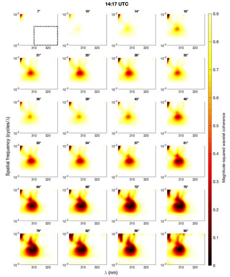 Wavelet coherence of spectra recorded at Masaya volcano on 14 March 2019 at 14:17 UTC. The MSWC was computed using the spectrum recorded at −61° from zenith as the reference (not depicted). White colour signifies an MSWC > 0.9, denoting high coherence between the measurement and reference spectra. Dark red shading indicates regions of low coherence and includes changes in the absorption signal due to SO. Black denotes an MSWC of 0, implying no correlation between the two spectra in the wavelength–spatial frequency domain. The MSWC is shown for a greater wavelength and spatial frequency range compared to the extraction window, marked by the dotted black line in the initial plot. The scan elevation angle corresponding to each spectrum is indicated above its respective plot. Data from scan elevation angles of 7° and 90° from zenith are shown. We assign wavelength information using an Hg spectrum recorded with the same spectrometer. Further details, including MSWC values for all spectra recorded in the 14:17 UTC instrument scan at Masaya across various wavelength ranges and spatial frequencies, can be found in Supplementary Material S4.
