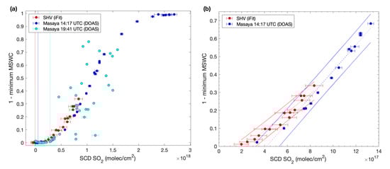 Relationship between the minimum MSWC and SCD of SO2. (a) One minus the minimum MSWC in the extraction window is displayed, compared to the SCD of SO2 determined by iFit at SHV and normalized SCD of SO2 at Masaya volcano determined by DOAS (taken from Figure 7b and Figure 9a,b). Vertical lines indicate the SO2 SCD determined by iFit (red, SHV) and DOAS (blue and cyan, Masaya) for the reference spectrum used to determine the wavelet coherence (spectra at elevation angle −61° from zenith). (b) The linear part of the relationship between the MSWC and SCD of SO2 is shown in panel (a). Trend lines represent the linear model (dotted line) and estimate of the 95% prediction level (solid lines) determined using MATLAB’s ‘polyfit’ and ‘polyval’ functions []. For selection criteria and the linear model’s estimate of 95% prediction level for Masaya scan at 19:41 UTC, please refer to Supplementary Material S5. Horizontal error bars indicate SO2 fit error from iFit and DOAS, respectively.